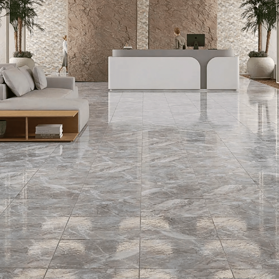Piso cerámico de tono gris oscuro y vetas grises con un acabado Cristal Lux de alto brillo. Su formato clásico y su elegante diseño lo convierten en una opción atemporal para hogares y proyectos comerciales que buscan un toque de distinción.